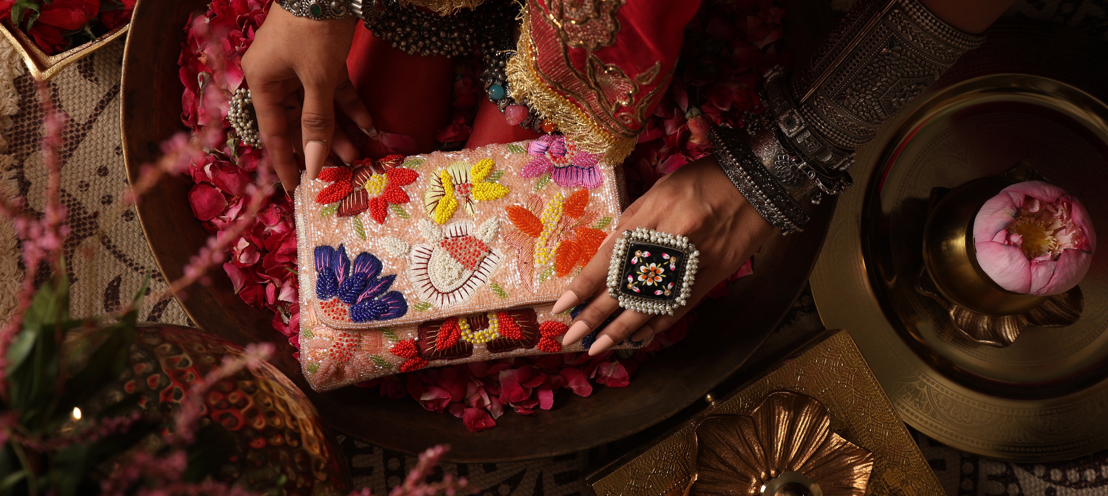 Complete your bridal look with our handcrafted designer and embroidered clutches. Timeless elegance for your wedding and celebrations!