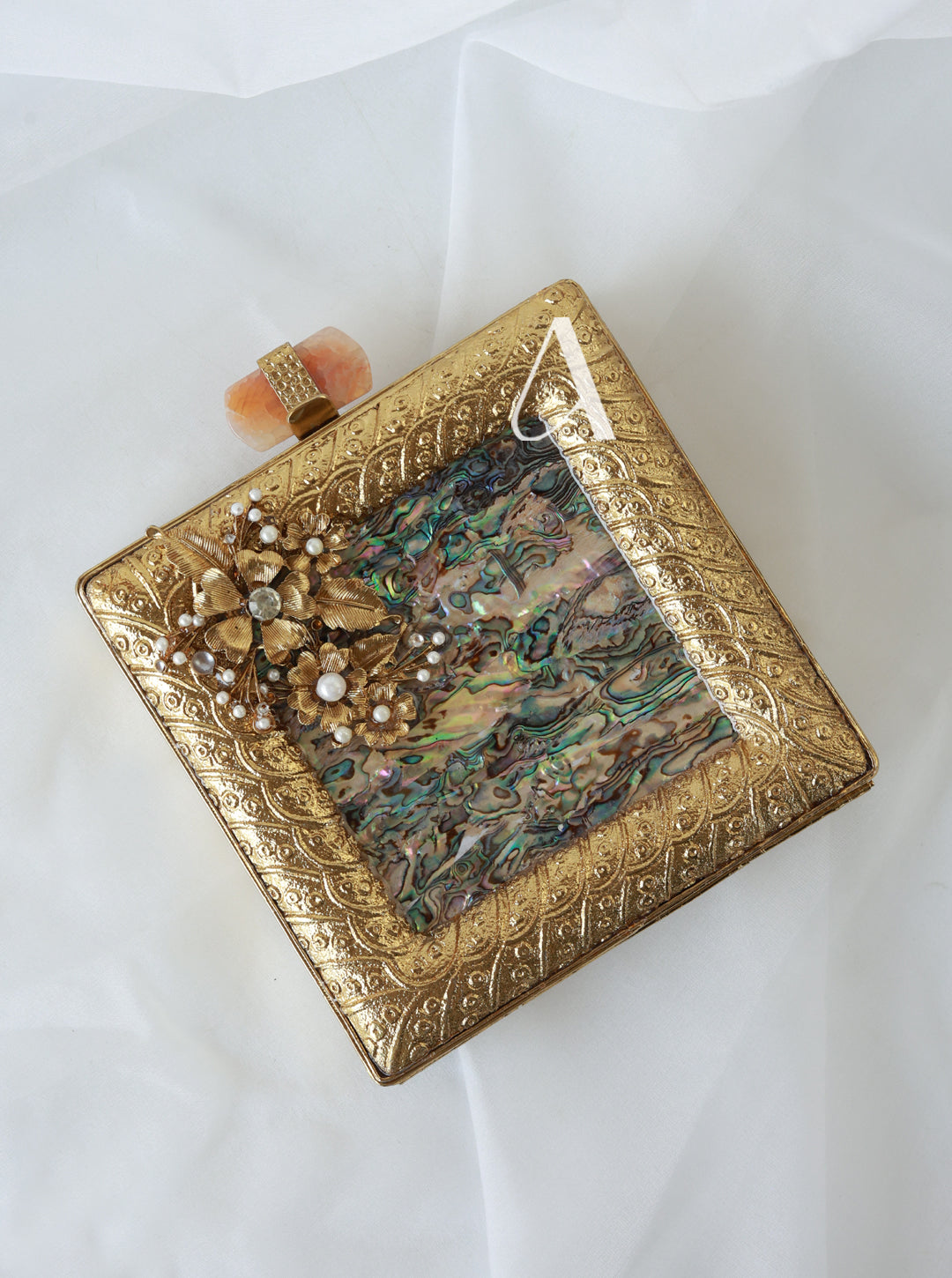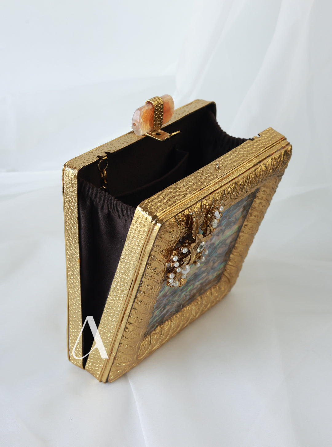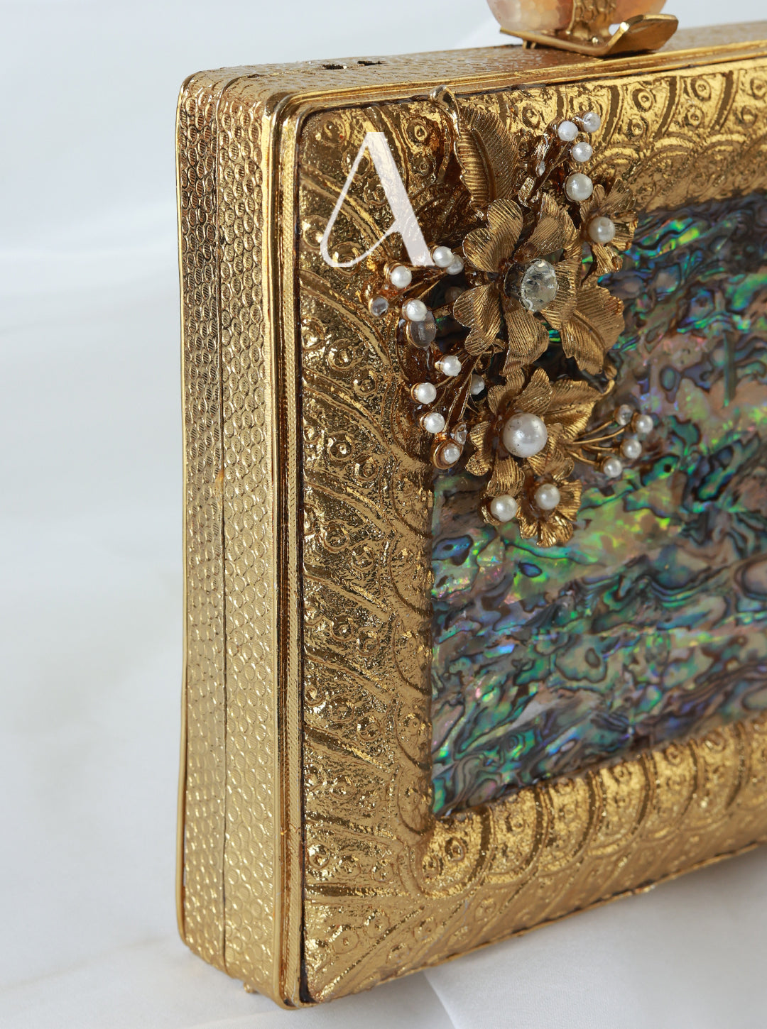 Aneesha is a luxurious handcrafted brass clutch featuring a radiant abalone shell inlay, glimmering with iridescent hues of green, blue, and purple. Embellished with a golden floral bouquet of antique metal, pearls, and crystals, the front design brings a regal and vintage charm. The back is crafted with embossed floral vines and a hammered brass texture, echoing timeless royal craftsmanship. Topped with a gemstone-cut clasp and completed with a matching golden sling chain.