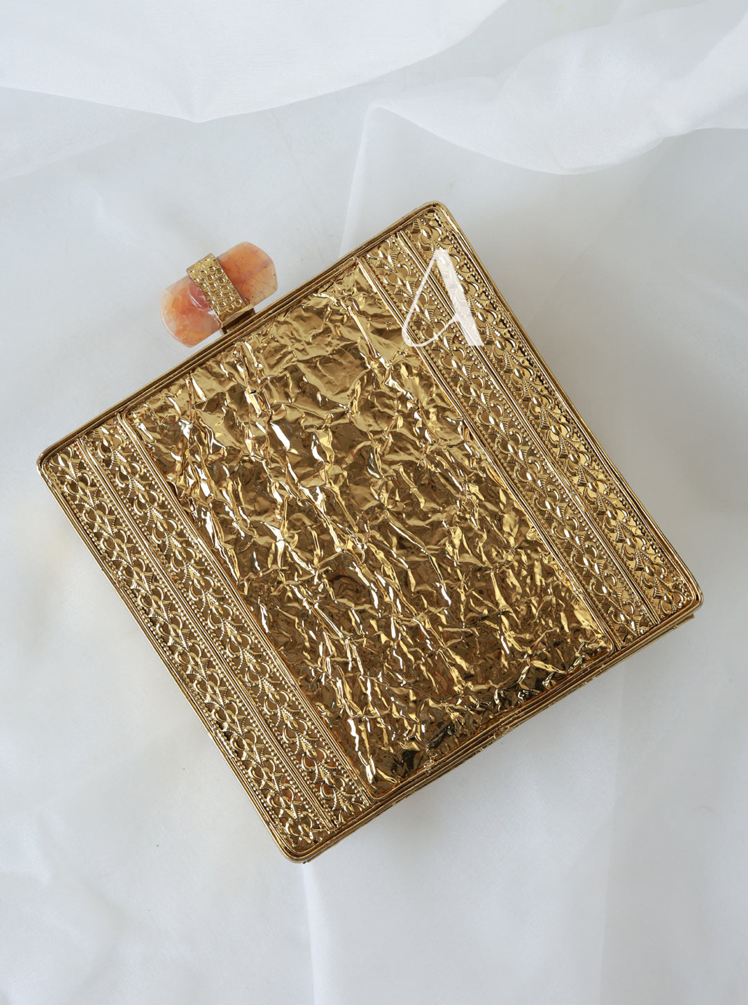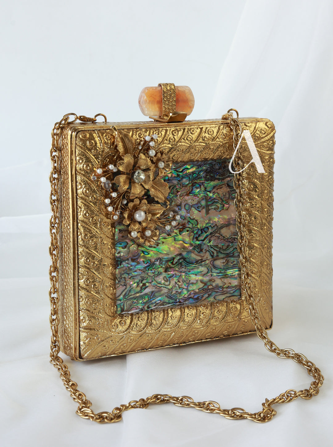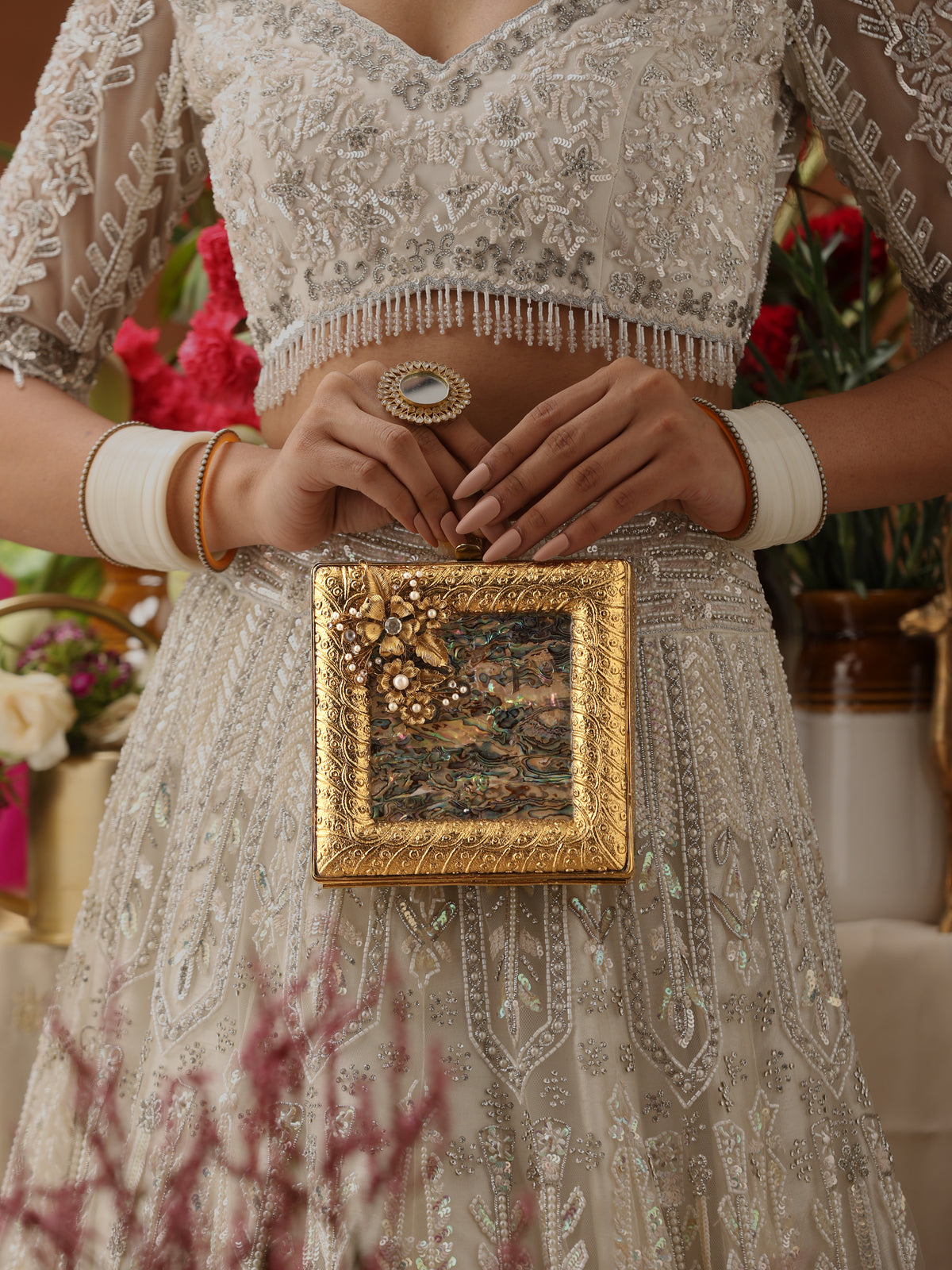 Aneesha is a luxurious handcrafted brass clutch featuring a radiant abalone shell inlay, glimmering with iridescent hues of green, blue, and purple. Embellished with a golden floral bouquet of antique metal, pearls, and crystals, the front design brings a regal and vintage charm. The back is crafted with embossed floral vines and a hammered brass texture, echoing timeless royal craftsmanship. Topped with a gemstone-cut clasp and completed with a matching golden sling chain.