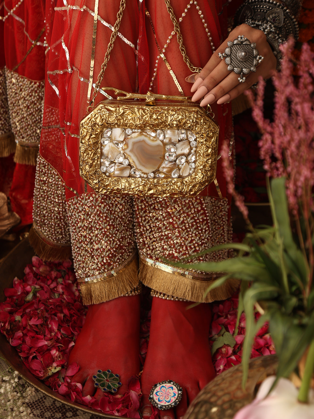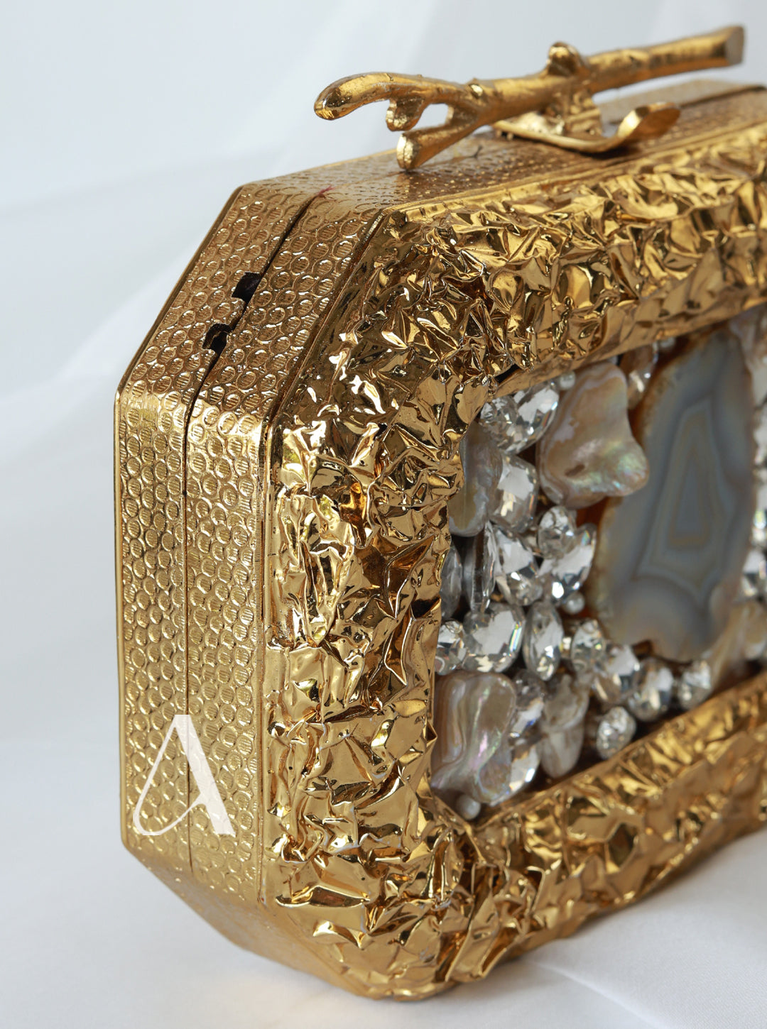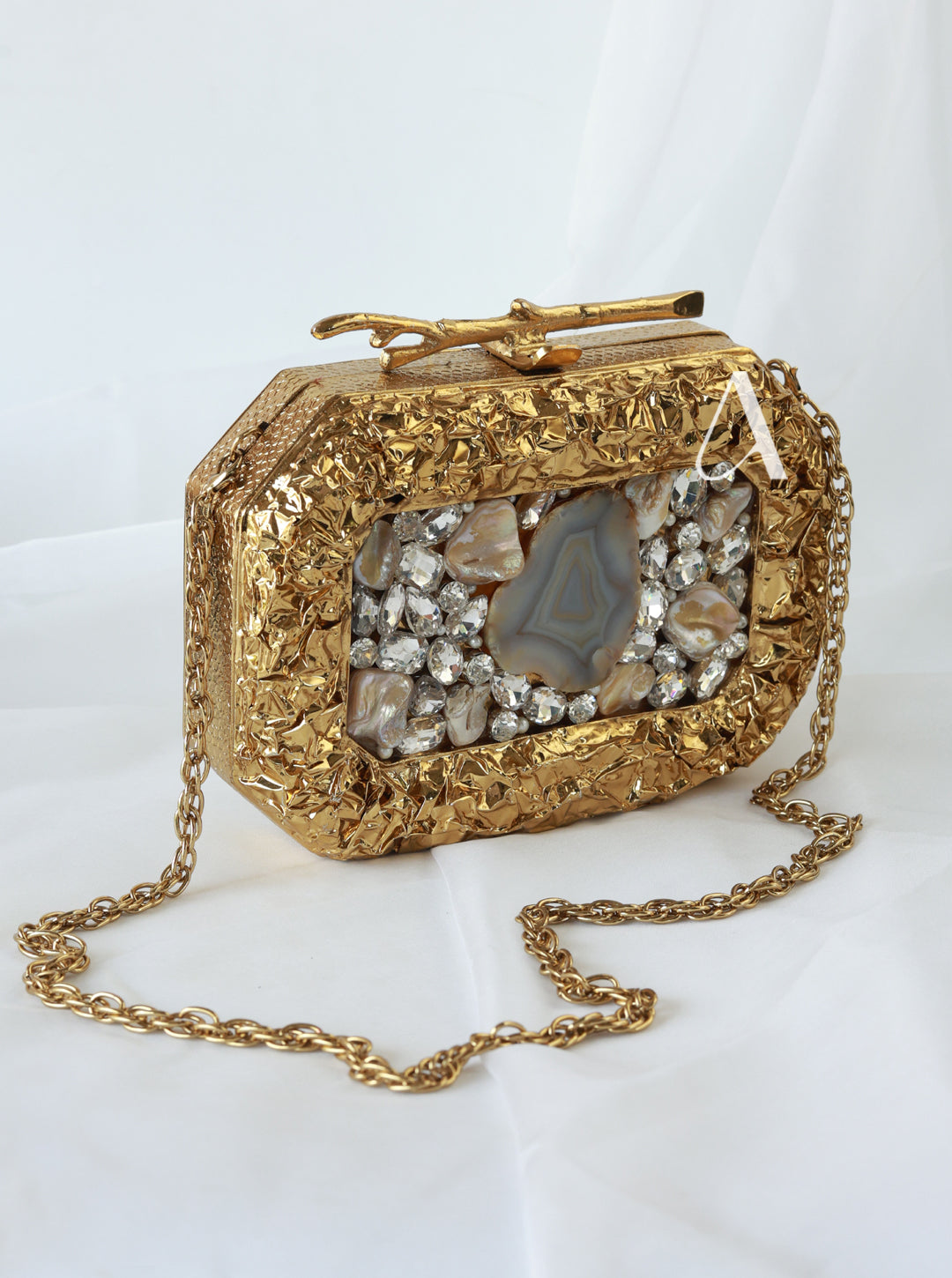 Introducing Aneraya, a striking octagonal brass clutch that captures the mystique of raw beauty and regal craftsmanship. The front is adorned with a captivating agate stone centerpiece, framed by luminous crystals and baroque pearls. The bold design is balanced with a structured antique gold brass body, and the top claspβsculpted like a tree branchβadds an earthy, artisanal finish. The back features a blend of embossed motifs and hammered brass textures for a royal yet rustic touch. Comes with a detachable gold sling chain for ease of styling.Β