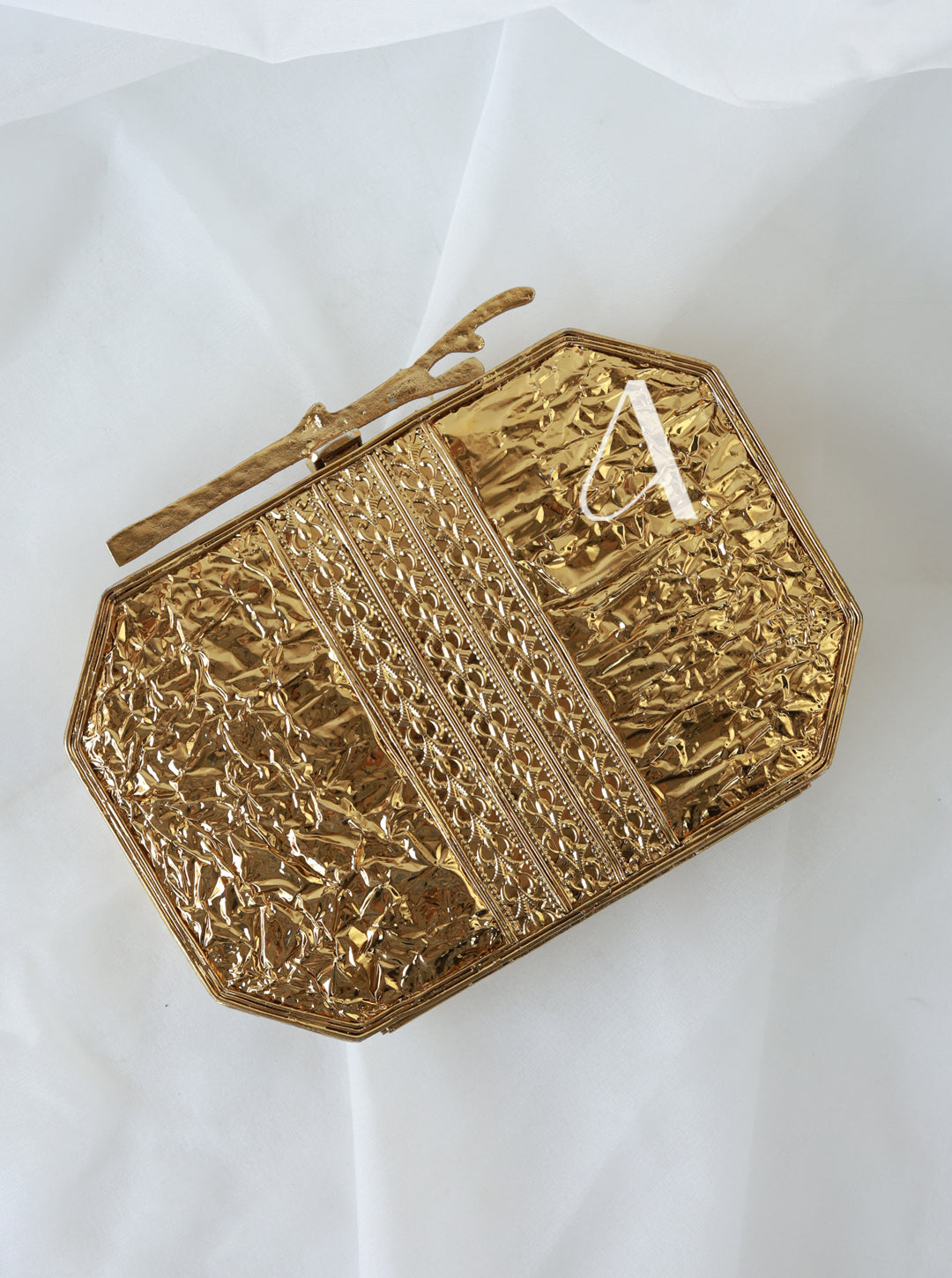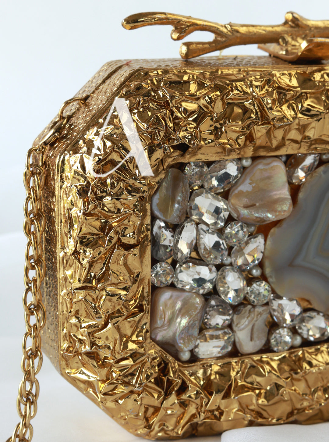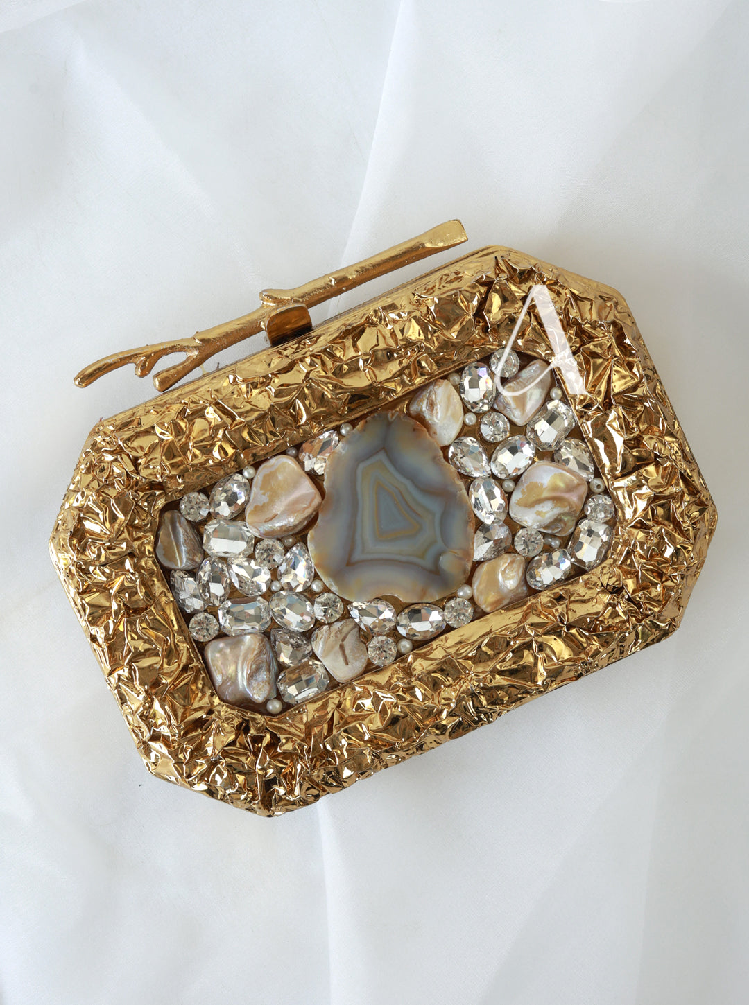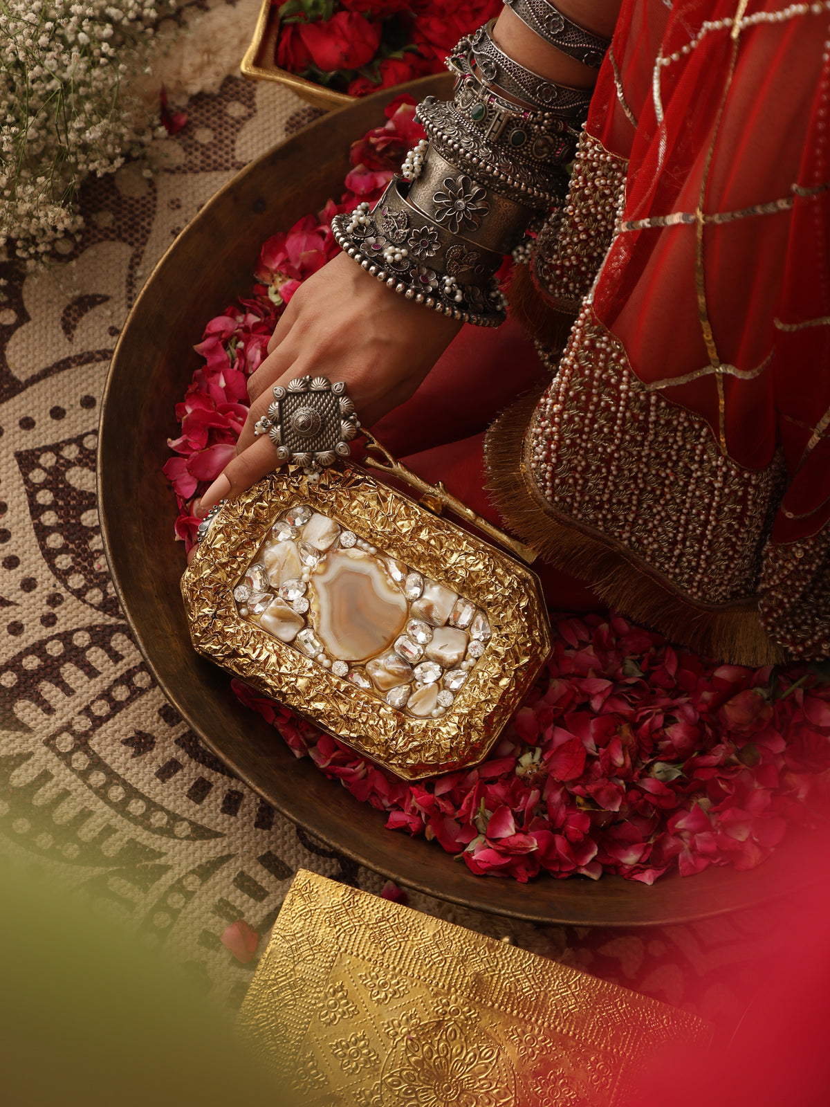 Introducing Aneraya, a striking octagonal brass clutch that captures the mystique of raw beauty and regal craftsmanship. The front is adorned with a captivating agate stone centerpiece, framed by luminous crystals and baroque pearls. The bold design is balanced with a structured antique gold brass body, and the top claspβsculpted like a tree branchβadds an earthy, artisanal finish. The back features a blend of embossed motifs and hammered brass textures for a royal yet rustic touch. Comes with a detachable gold sling chain for ease of styling.Β