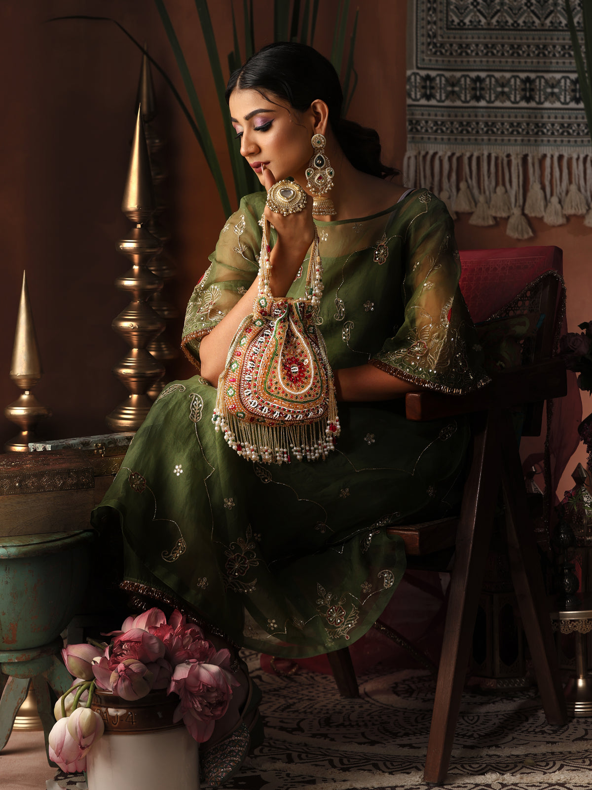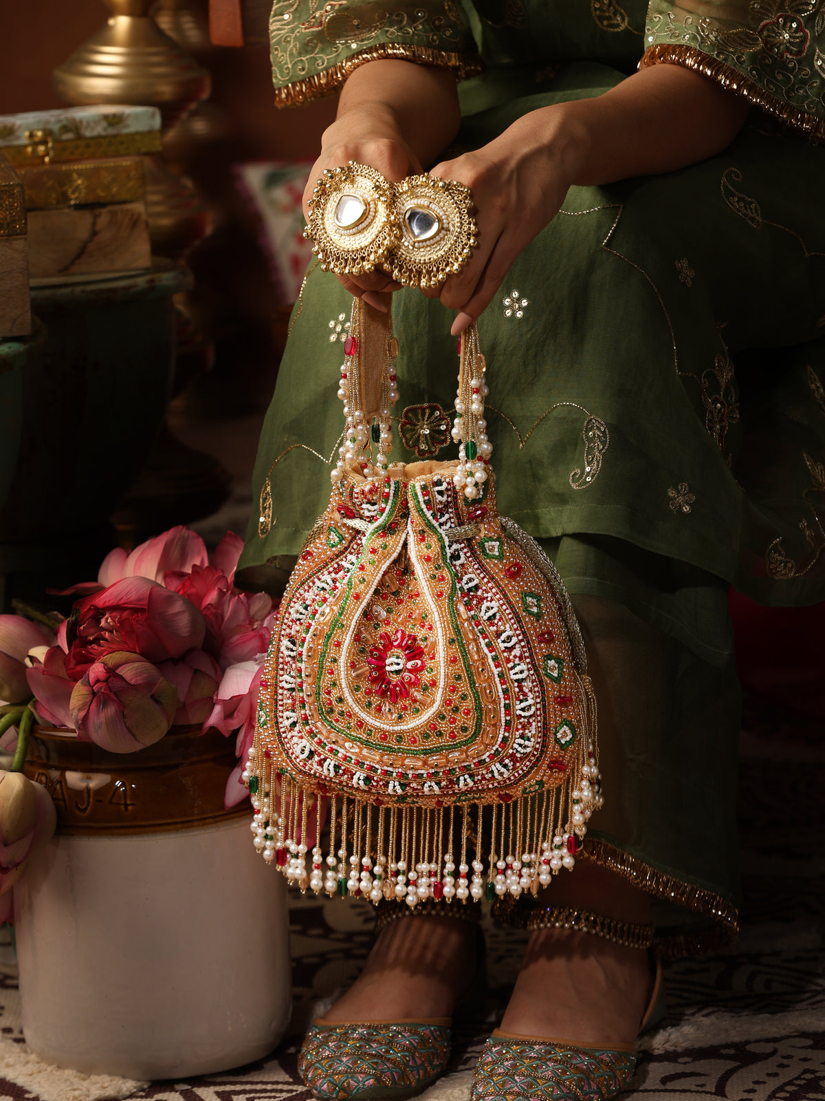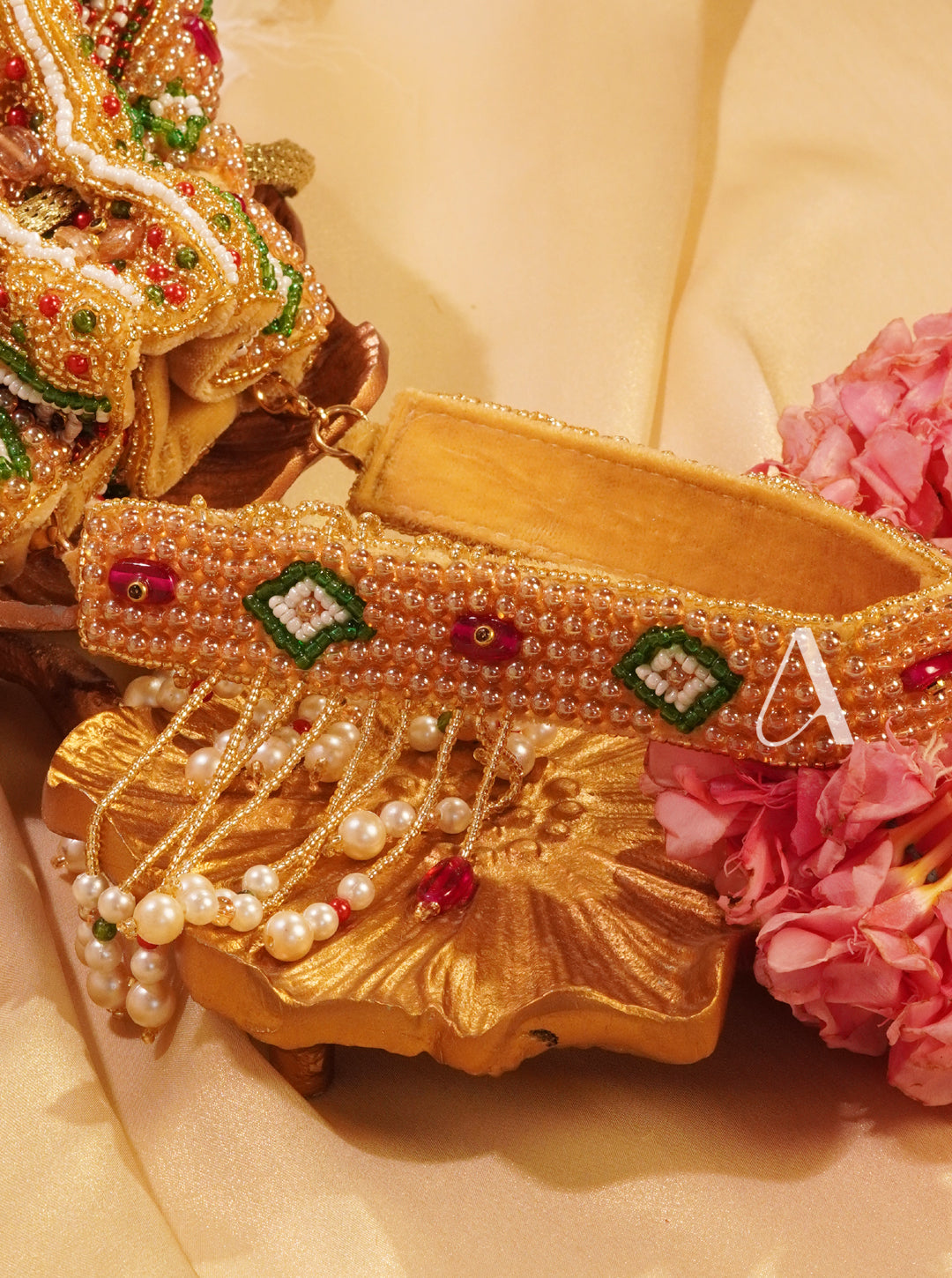 A stunning bridal potli in a regal mustard gold hue, Benazir is hand-embroidered with vibrant accents of ruby red, emerald green, ivory, and golden beads. The intricate zardozdi work forms floral and geometric motifs throughout, highlighted by pearl fringes and beaded tassels. The back features the same elaborate embroidery, while the double handle is equally embellished with pearls and sequins, making it ideal for weddings and grand festivities