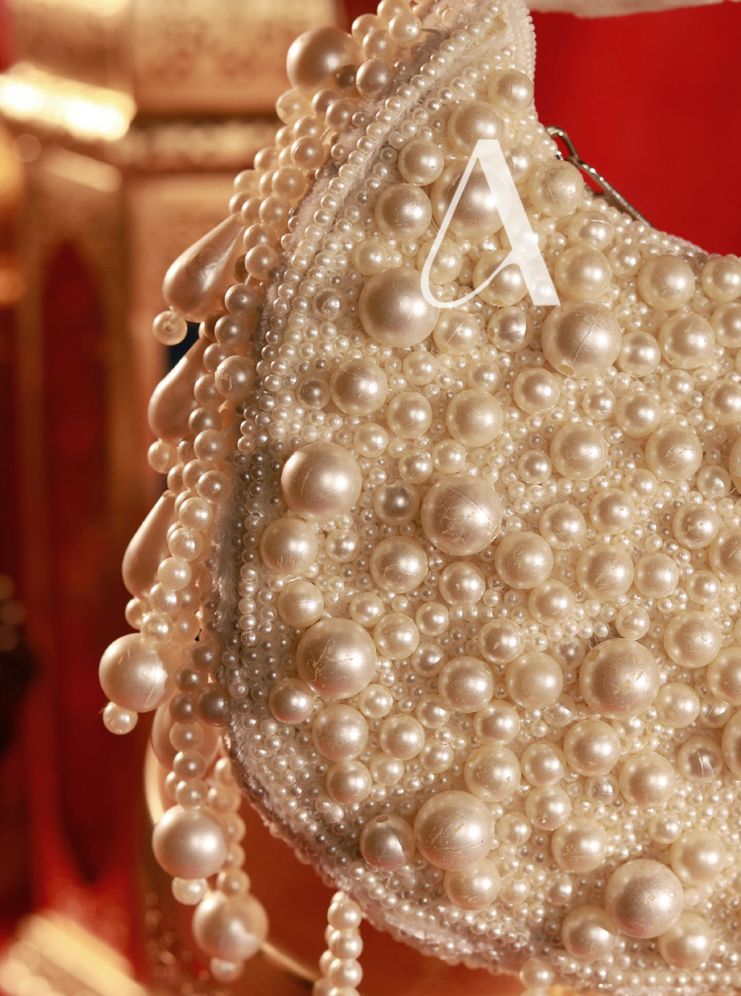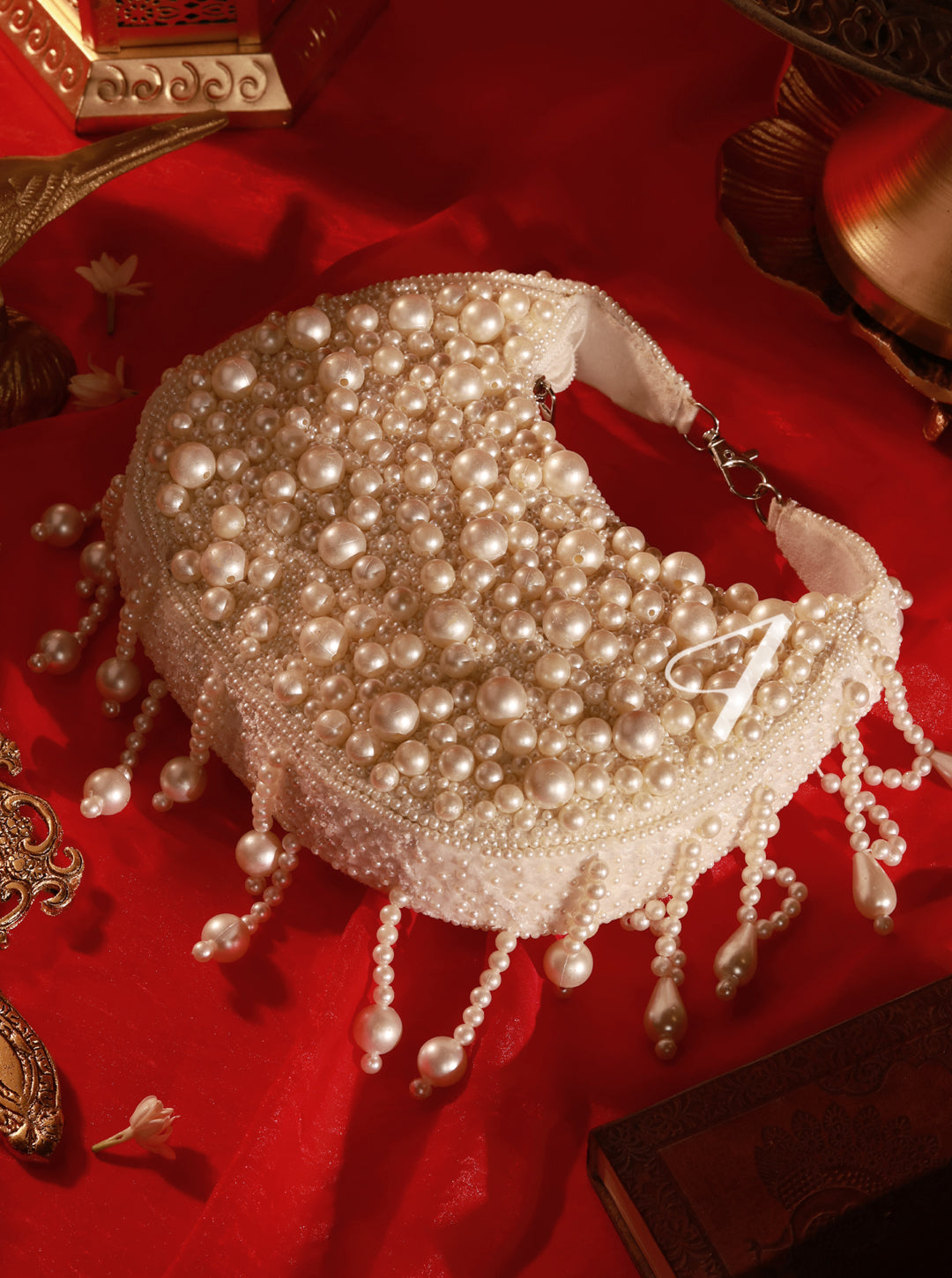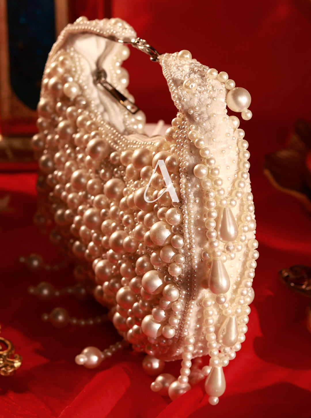 A stunning ivory hobo bag fully adorned with an array of pearls in assorted sizes to create a luxurious, textured surface. The delicate pearl tassels along the edges add movement and a graceful charm. The soft velvet handle provides comfortable grip, and a sturdy clasp ensures secure closure. A perfect fusion of opulence and sophistication.
