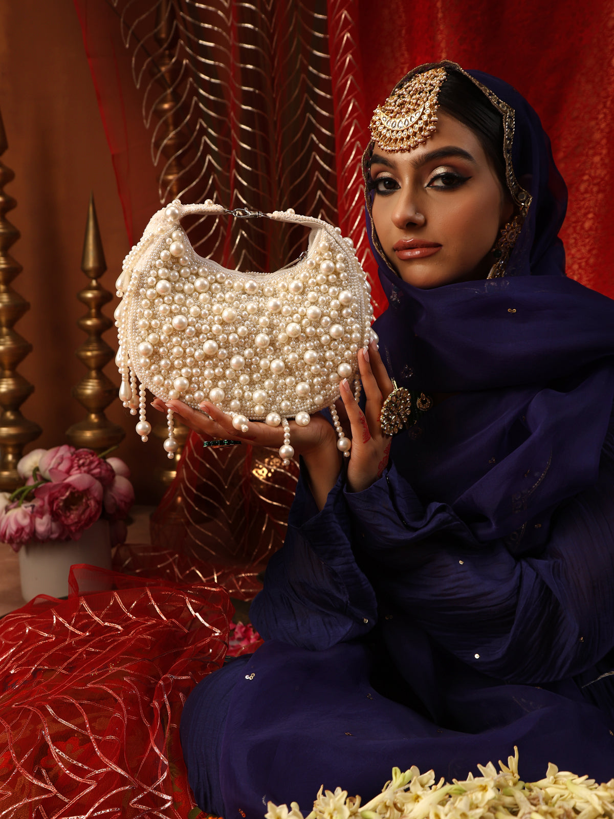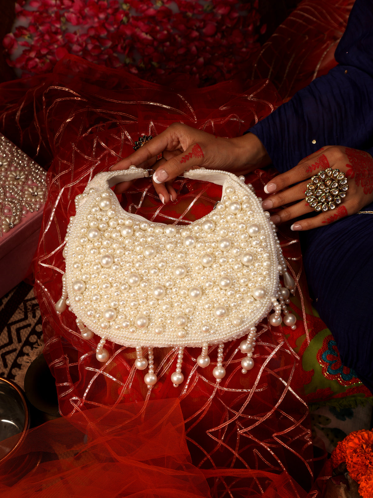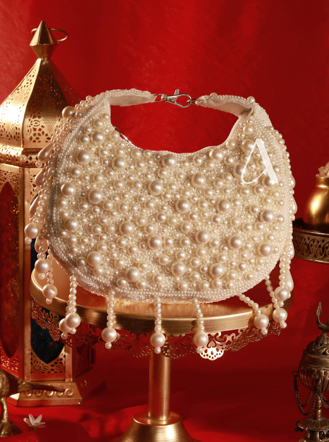 A stunning ivory hobo bag fully adorned with an array of pearls in assorted sizes to create a luxurious, textured surface. The delicate pearl tassels along the edges add movement and a graceful charm. The soft velvet handle provides comfortable grip, and a sturdy clasp ensures secure closure. A perfect fusion of opulence and sophistication.