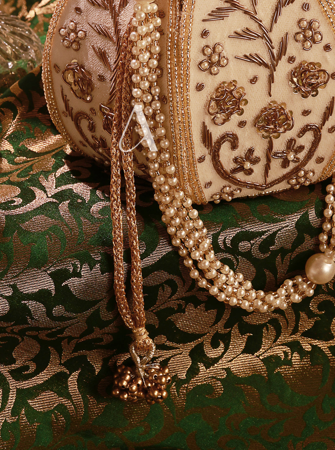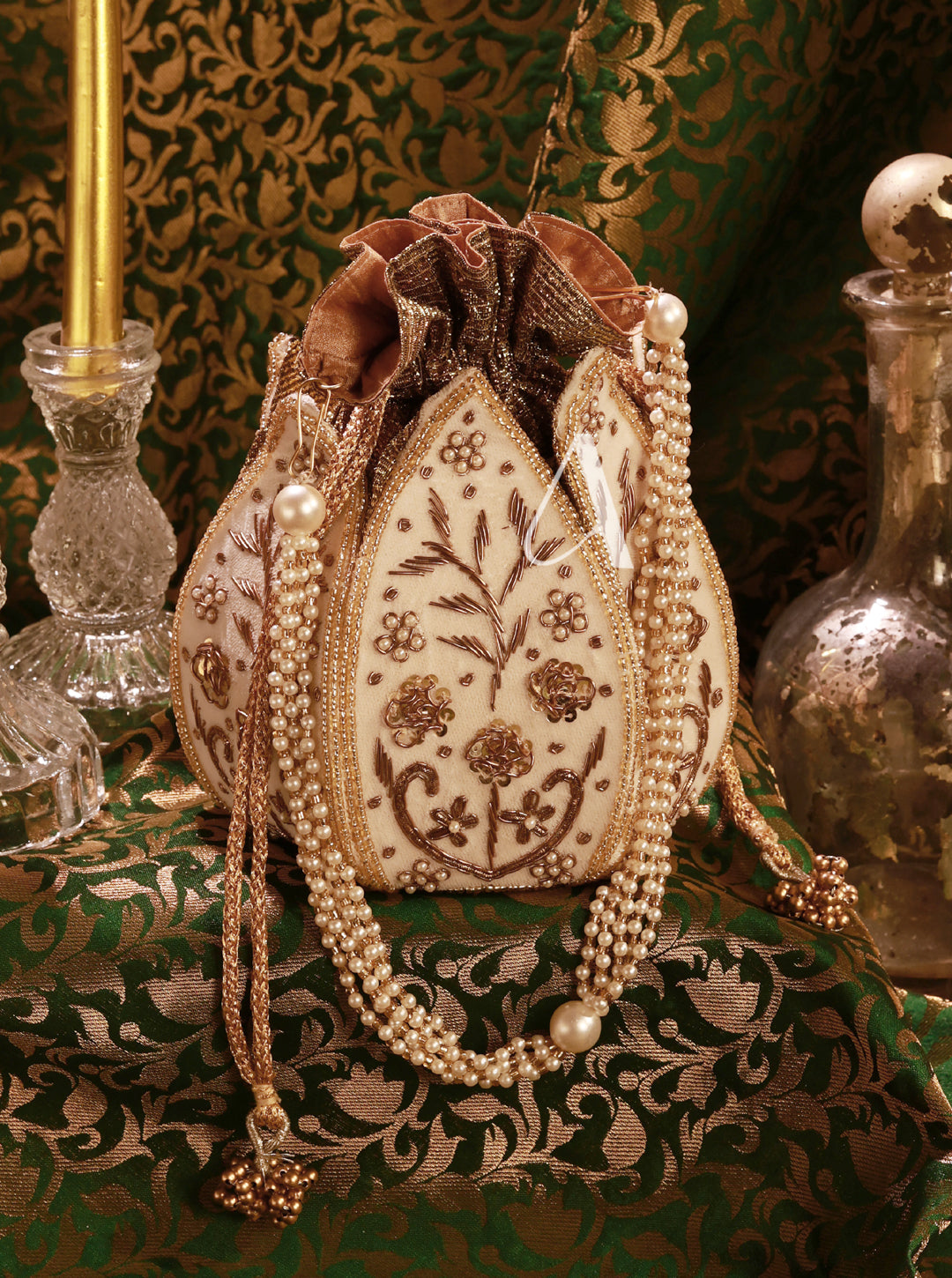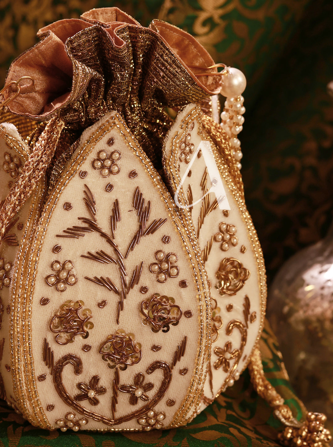 - Material: Velvet base with hand-embroidered pearls, crystals, and mirrors