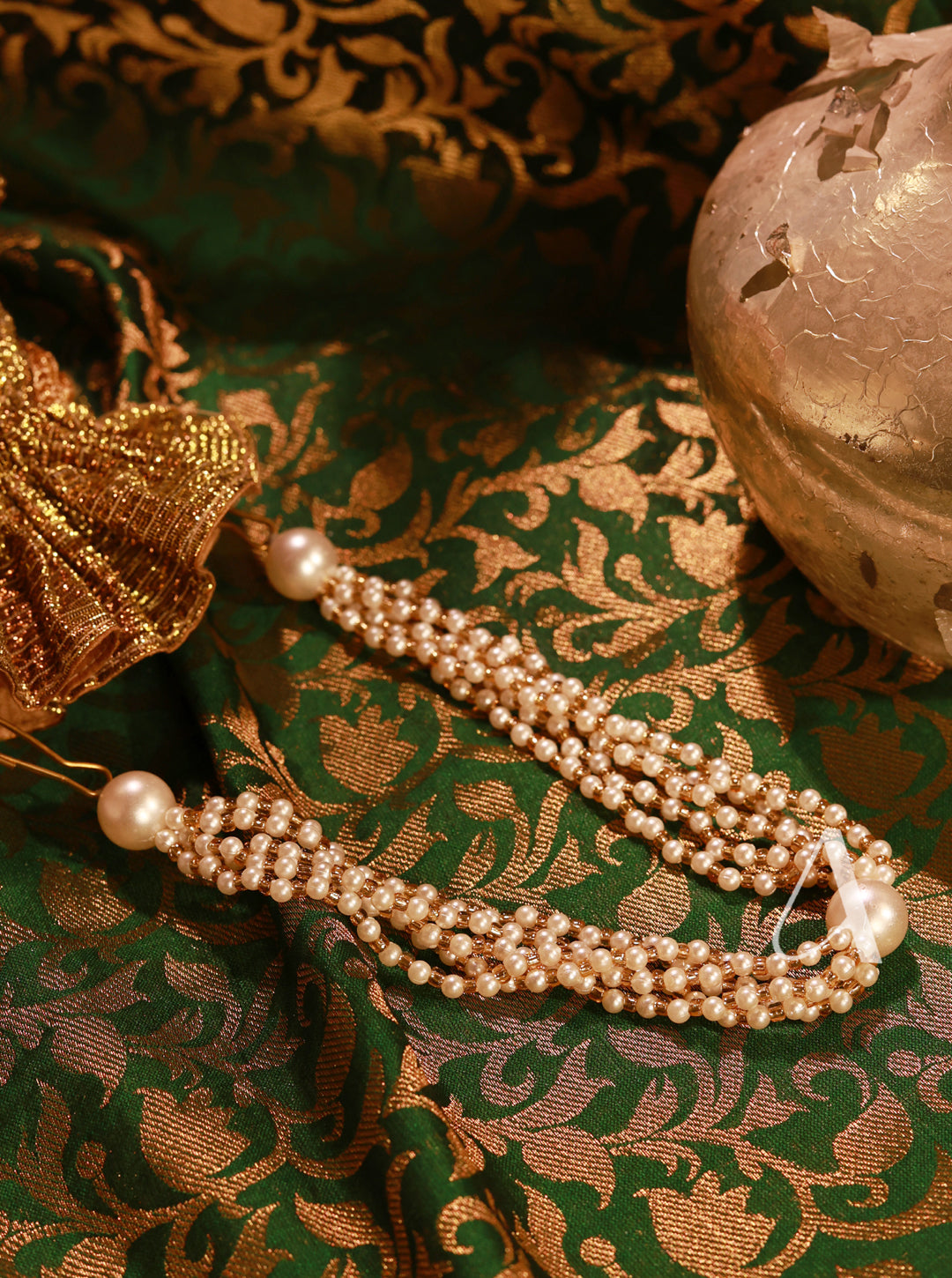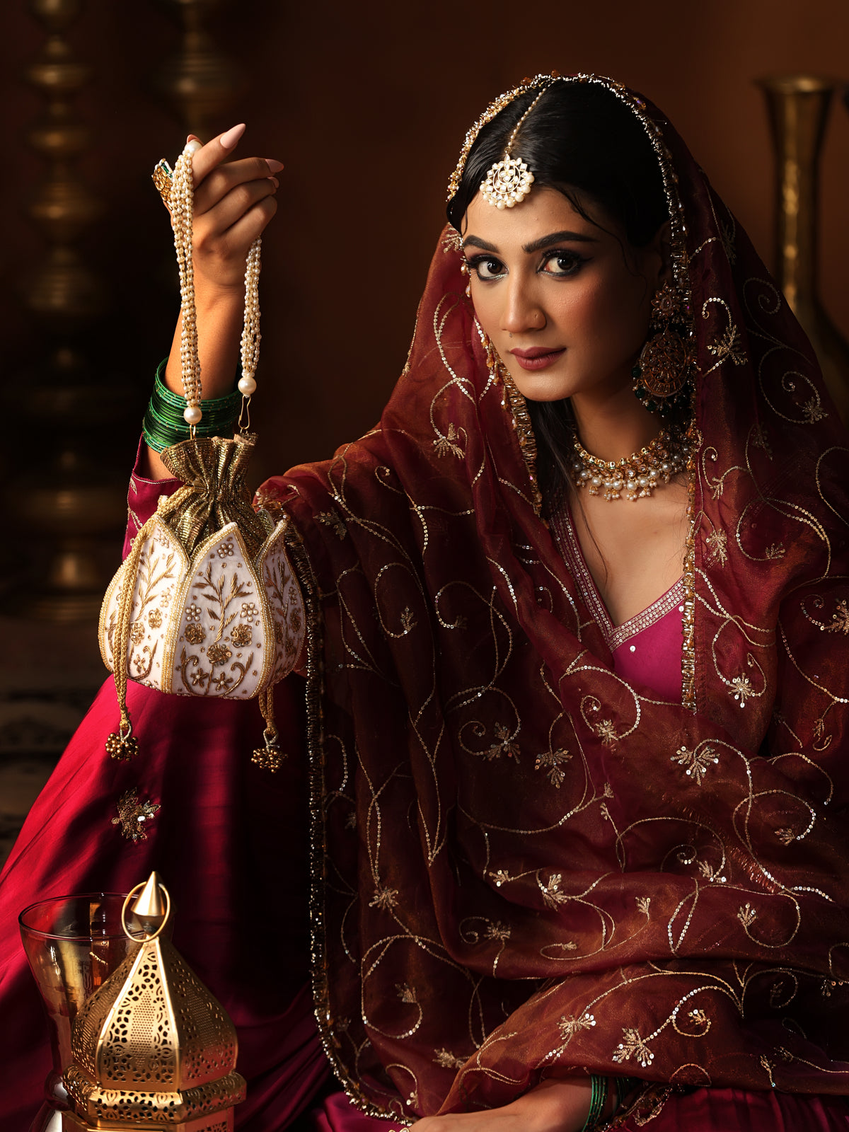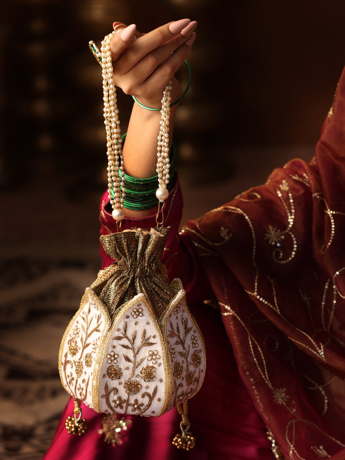 - Material: Velvet base with hand-embroidered pearls, crystals, and mirrors