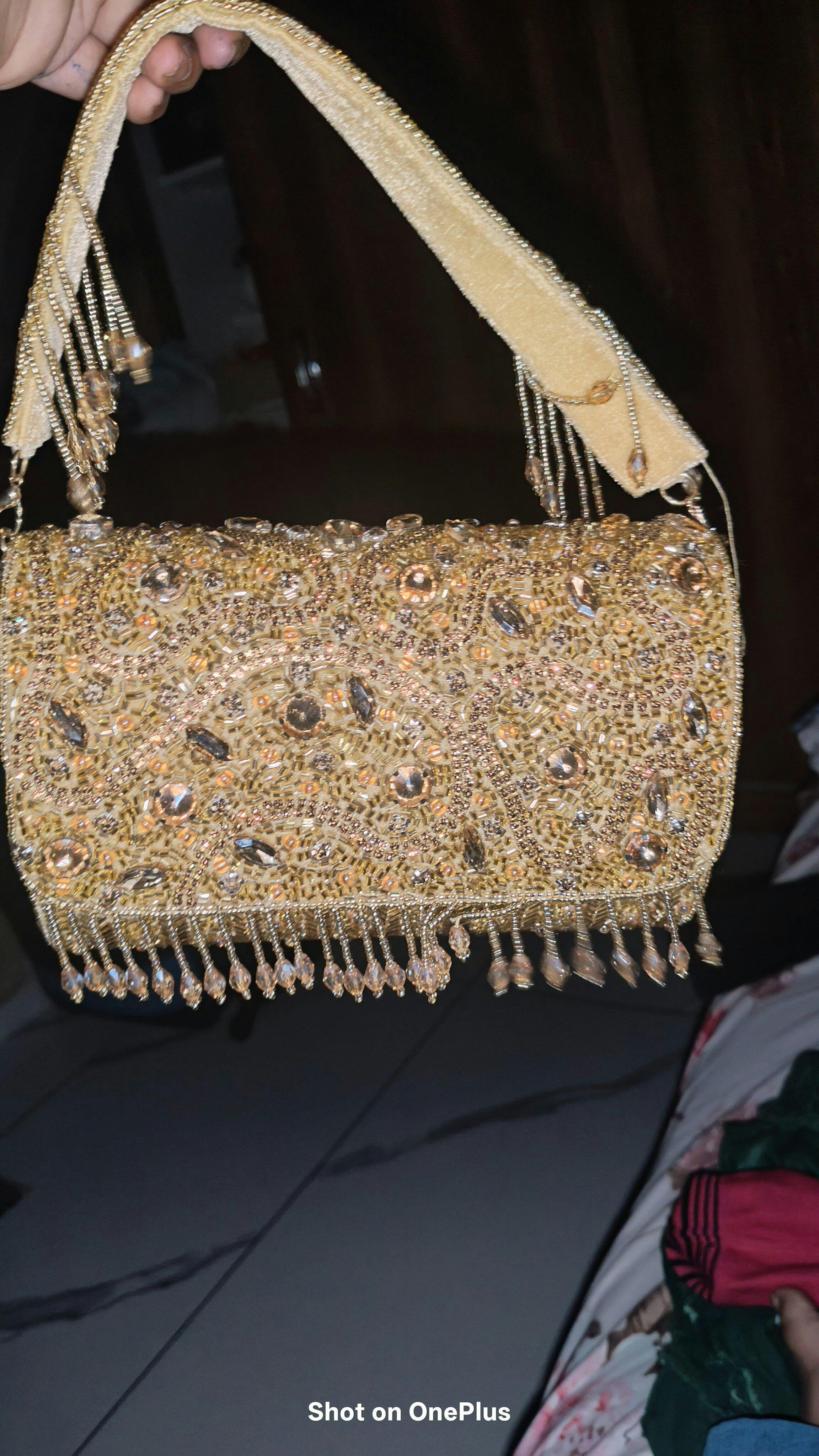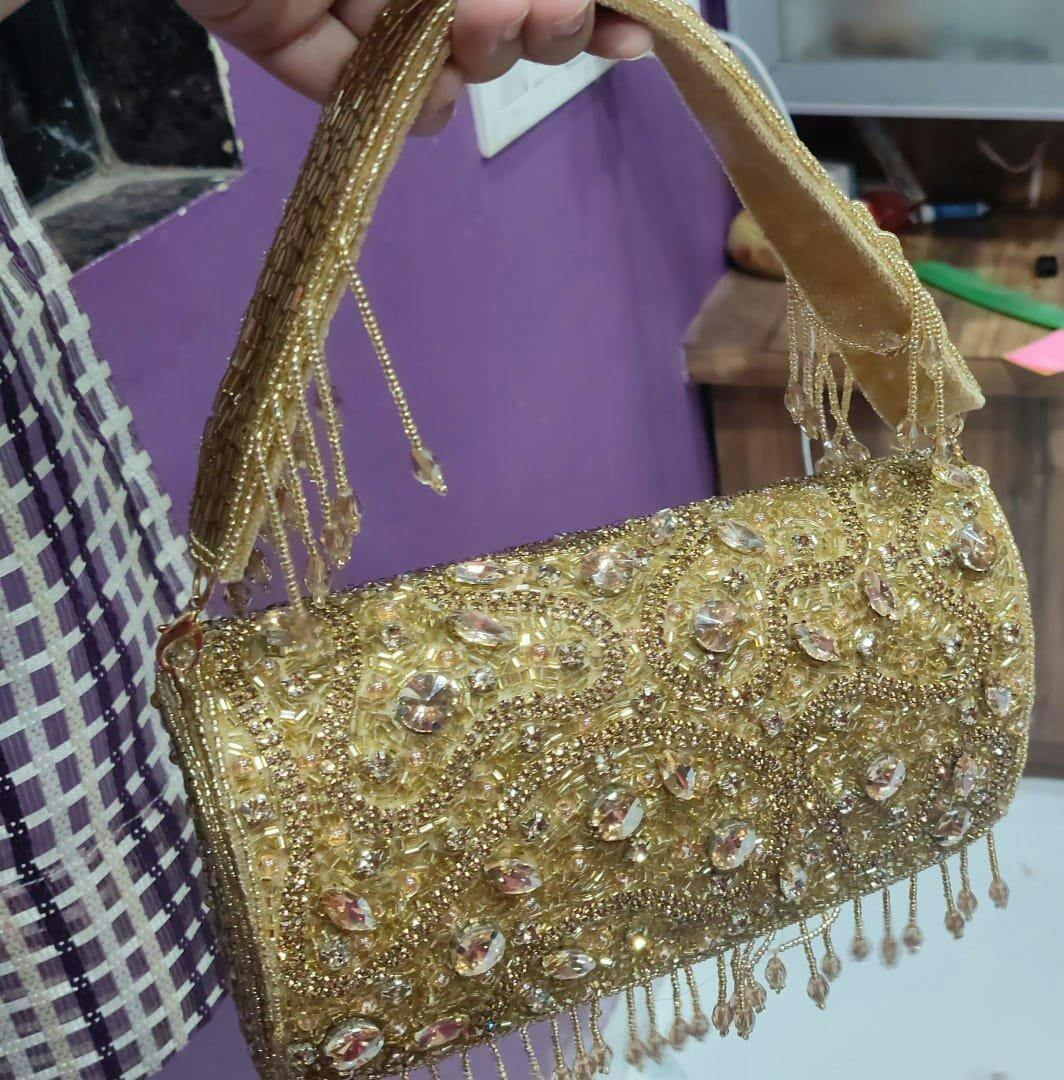 An exquisite golden handbag inspired by timeless Punjabi grace, Heer Ranjhna is drenched in shimmering crystal work and intricate golden bead embroidery. Its heavily embellished front flap is complemented by a rich velvet handle finished with dainty sequin tassels—perfect for festive and bridal occasions where every detail speaks of royalty.