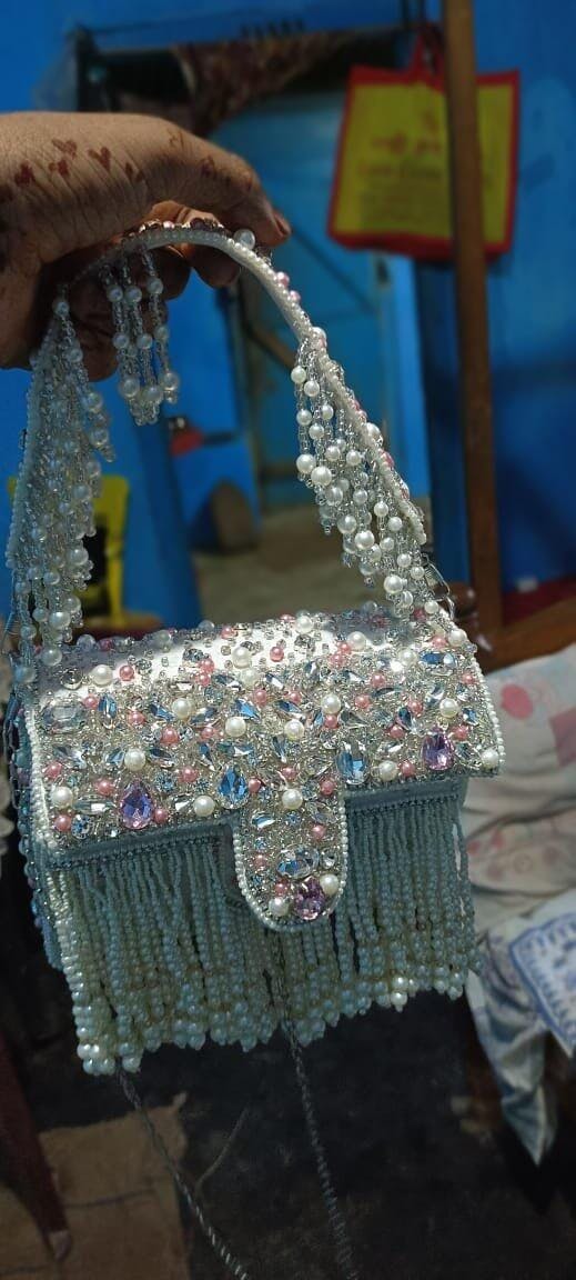An ethereal ivory box clutch drenched in hand-embroidered pearl, crystal, and cutdana work. Accented with baby pink beads and champagne tones, this bag exudes soft glamour. The front flap is intricately designed with clustered embellishments and dramatic pearl tassels, while the thick handle features cascading strands of pearls and shimmer. The back mirrors the beauty of the front, making it an all-around masterpiece.